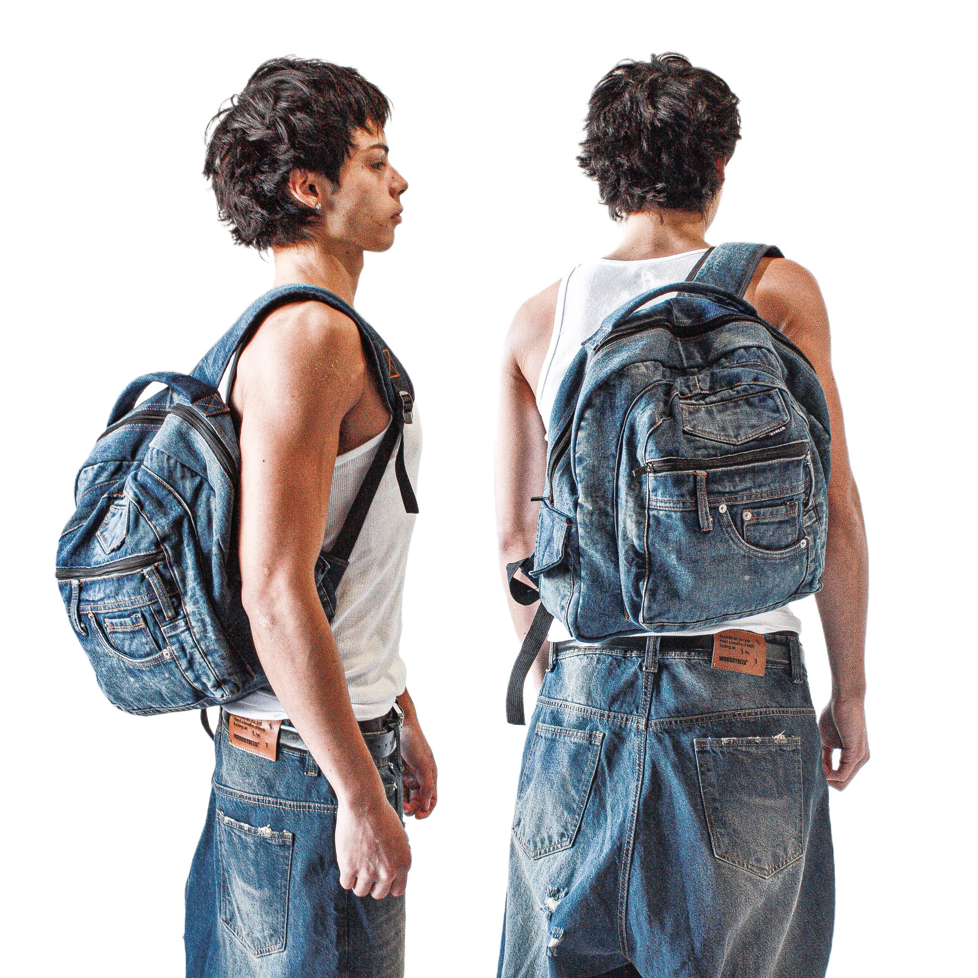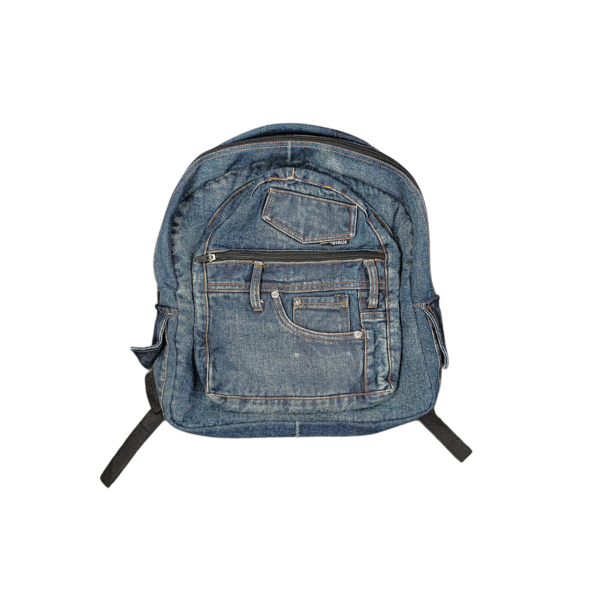 Fully cut and sew denim fabric... Nylon interior... Two large pockets... Zip pouch... 16 inch backpack... Laptop sized... Washed with label
